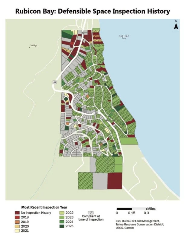 The attached map shows compliance by parcel as of its latest inspection. If you are not yet compliant, please use the new 3-Year Plan to guide your efforts, and/or schedule an inspection from North Tahoe Fire at the link below. They will provide a checklist of actions to take in order to gain compliance. You may also request a new inspection if you believe you have gained compliance since your last inspection but the map doesn’t reflect your current status.