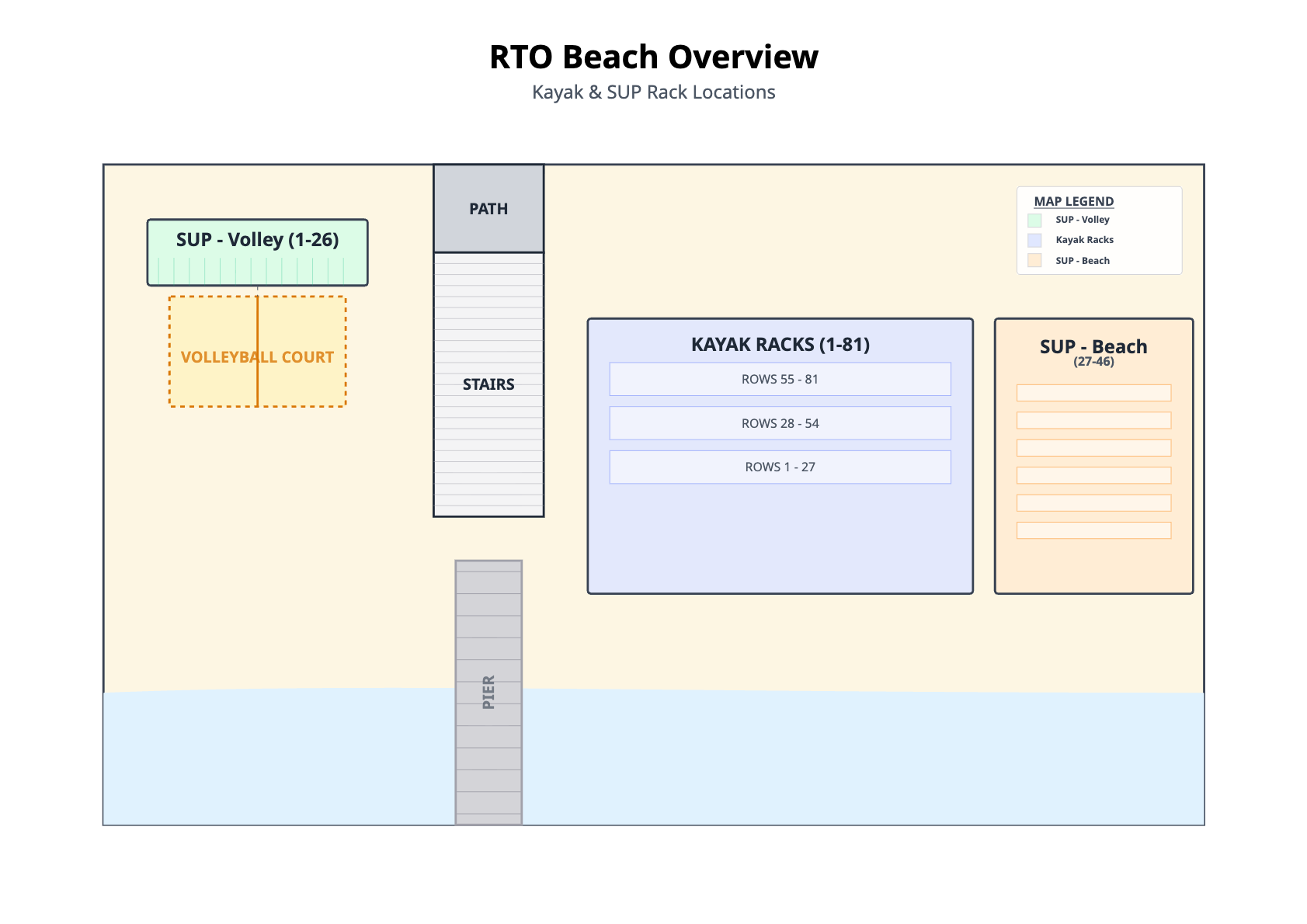 To leave your Kayak, SUP, or canoe on the South beach overnight, you must rent a storage space for the summer season. Any Kayaks, SUPs, or canoes left on the beach overnight without a designated slot assignment may be removed.
